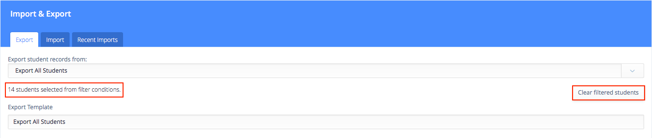 Clear Filters from Export Templates: If you have previously filtered for students, selected them for export, and then saved this as an export template, you can now view how many students were selected by the filter, and clear the filter, if necessary. This allows you to more easily see how many students will be included in the export, and to re-use and update export templates, which may have previously only included the filtered students.