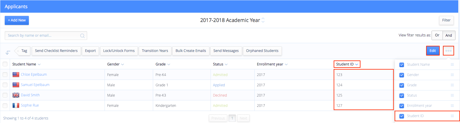 View, Sort and Edit Student ID on Rosters: You can now choose to display the Student ID on the Inquiries, Applicants, Students, and Alumni rosters. Click the 'three dots' icon, then check the box next to Student ID and click Save. Once the Student ID column is displayed, you can sort by clicking the arrow on the Student ID column, or edit in bulk by clicking the blue Edit button. This allows you to easily view, sort and edit Student ID in bulk.
